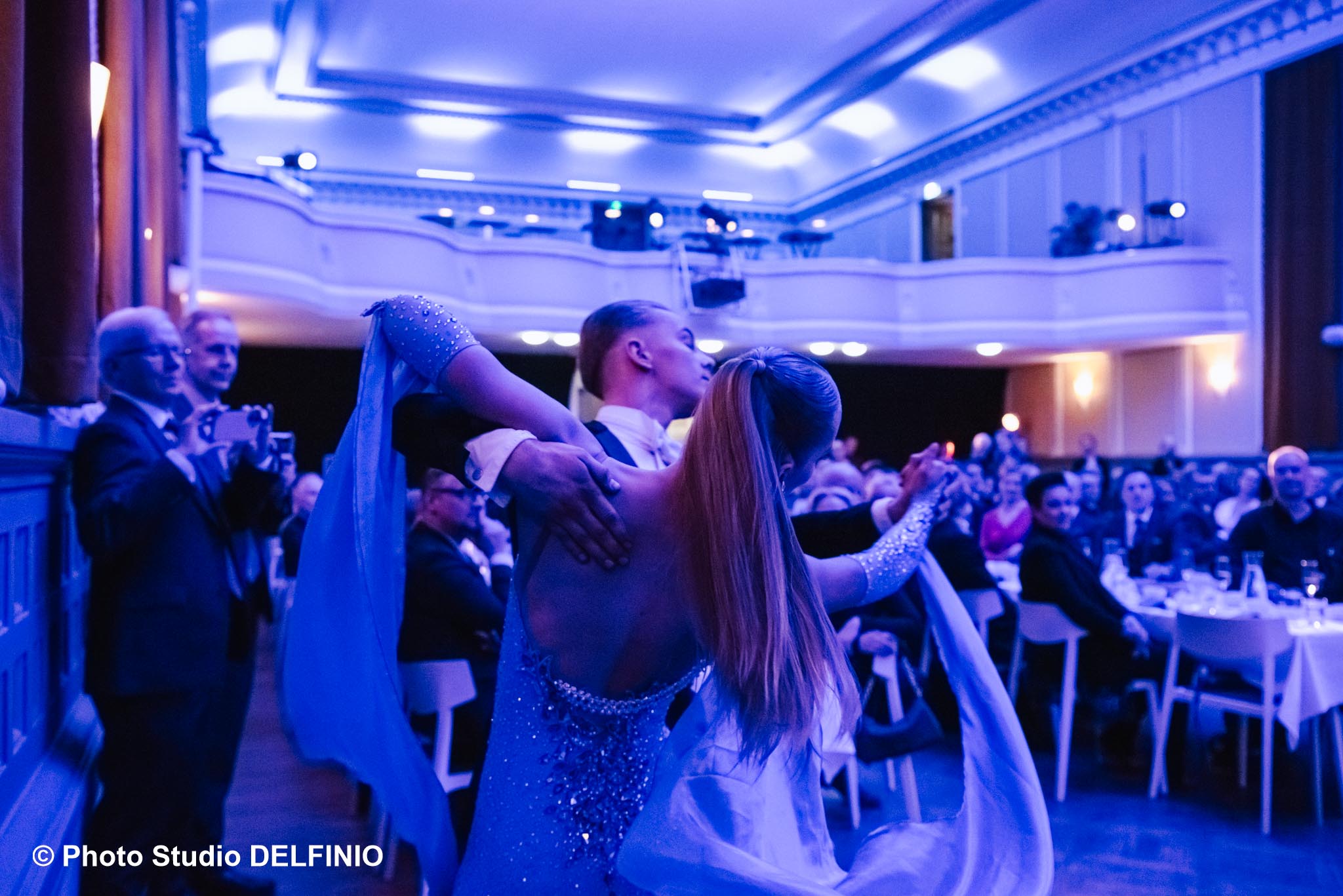 Parvekkeelta avautui yksi illan vaikuttavimmista näkymistä. Ylhäältä katsottuna juhlasali muistutti elävää merta – valoja, liikettä, keskusteluja ja tanssia. Sininen valaistus toi tilaan syvyyttä, aivan kuin katselisi merta laivan kannelta.
